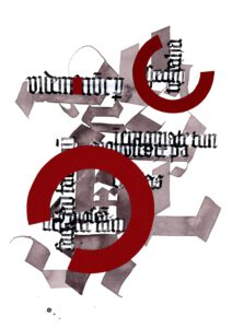 Mir lag nicht daran, den Text leserlich abzuschreiben, sondern ich wollte Textfragmente (quasi das „Stückwerk“ von dem im Text auch die Rede ist), neu zusammensetzen: in Linien, Kreisen, in zwei Farben, Rot und Grau.